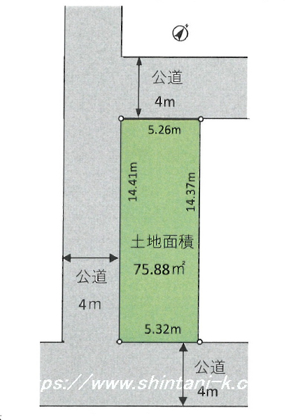 | 接道 | 南東 4m(幅員) 公道 5.3m(接面) 南西 4m(幅員) 公道 14.4m(接面) 北西 4m(幅員) 公道 5.2m(接面) |